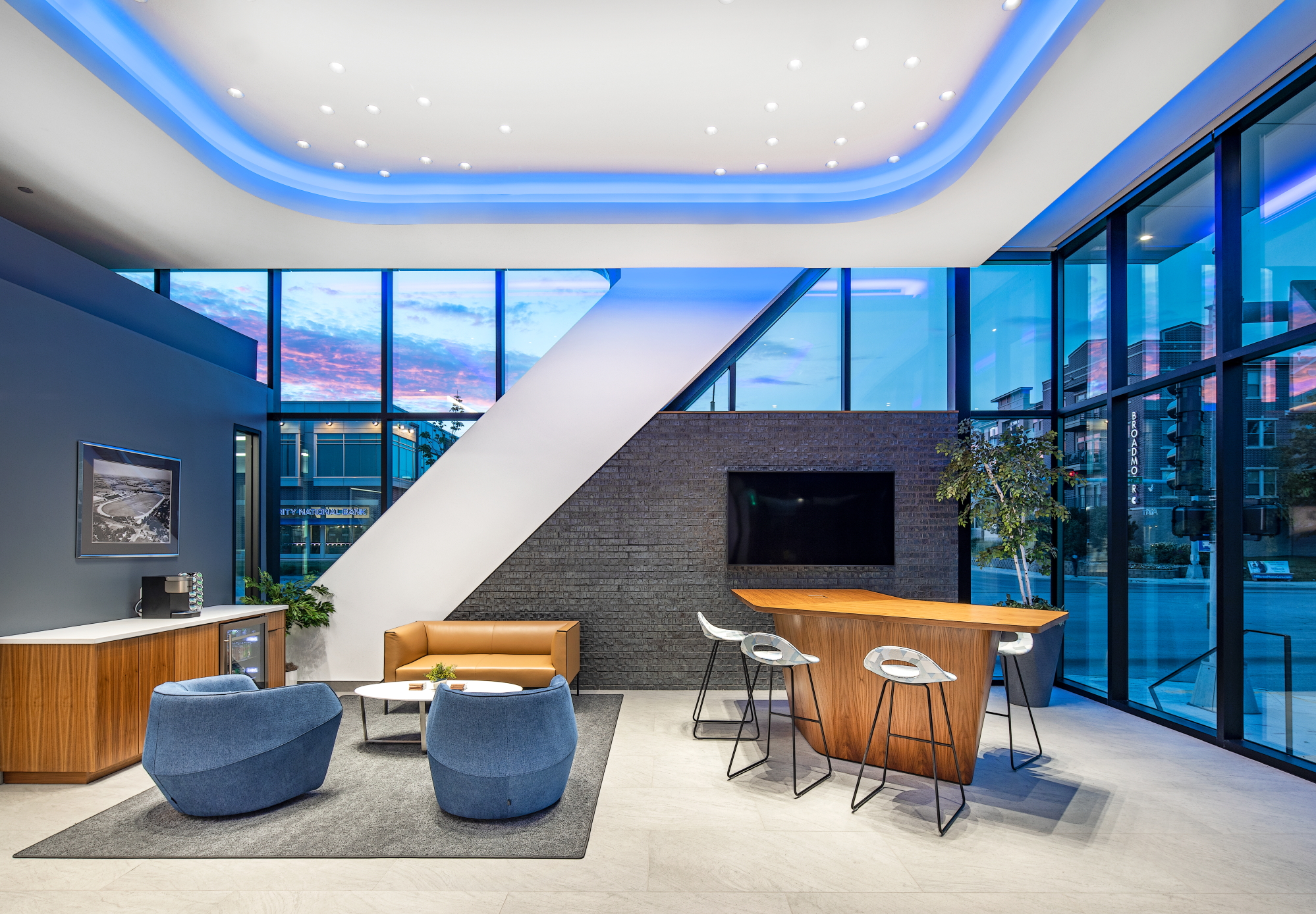 The 2,929sf bank branch building has some innovative features including a deemphasized teller line and large seating area for more imformal face to face interaction with the bank's clients. The design also includes linear lighting and soffit areas to creat various looks during both day and night. The office areas were built on a small scale to create a box-in-box look and enhance natural light with the increased curtain wall exposure.