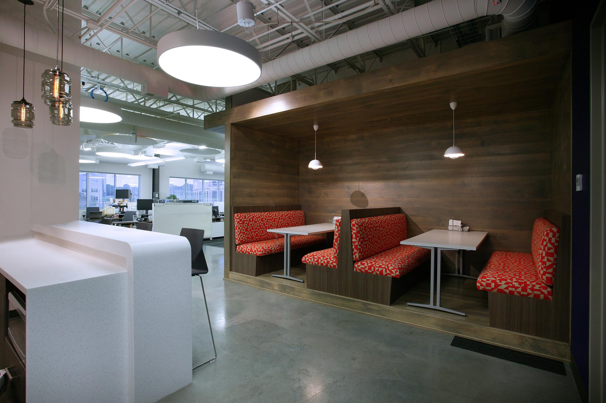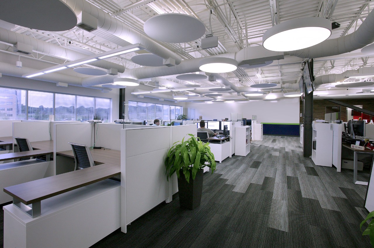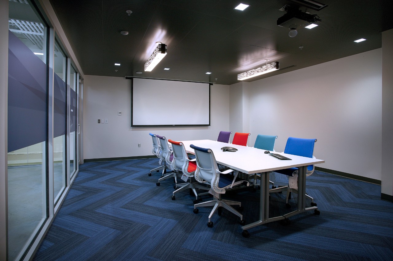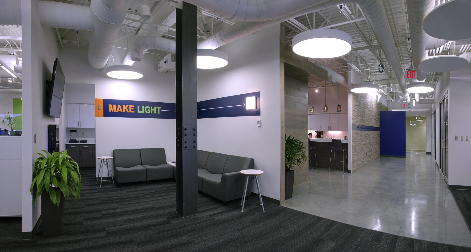 This open office concept included many types of finishes and architectural features to create a collaborative work space for the technology staff.